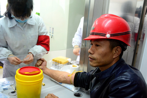 志愿者们为工人采集血液,抽血化验